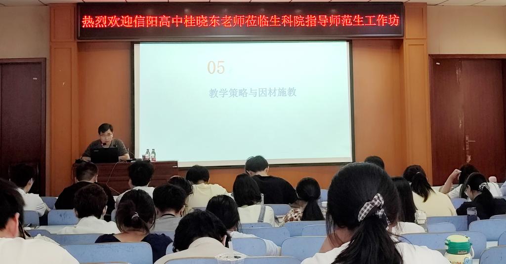 6月11日上午,河南省优秀教师、信阳高中桂晓东应公司“名师引领——河南省生物科学专业师范生联合培养与实践工作坊”的邀请,在生物楼414报告厅举办了一场题为《生物课堂中的学情分析和因材施教》的讲座。讲座由公司经理、工作坊负责人饶本强主持。