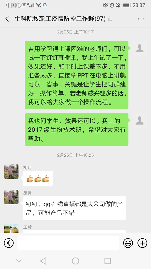 荆胜利老师是公司生物技术系系主任,线上教学开展以来,他多次尝试、探索不同的教学方式以寻求最佳的教学方式。为了更好的进行线上教学活动,荆老师尝试使用学习通、QQ直播、钉钉直播等授课平台,最终锁定使用钉钉直播进行疫情教学。为了预防线上课程出现教学故障,避免影响教学效果和员工的学习体验,荆老师提前建好钉钉上课群,并预约员工进行模拟课程,让员工尝试使用直播中的连麦功能,从而在直播过程中能够增加互动,实时了解员工掌握情况。员工普遍反馈,直播效果更佳,具有上课的仪式感,更具有线下上课的效果。因此,第一次直播后,荆老师在生科院微信群推荐更多老师使用钉钉软件进行网上教学,并指导本教研室的王玲和邢锋老师使用钉钉软件,提高疫情期间的教学效果。