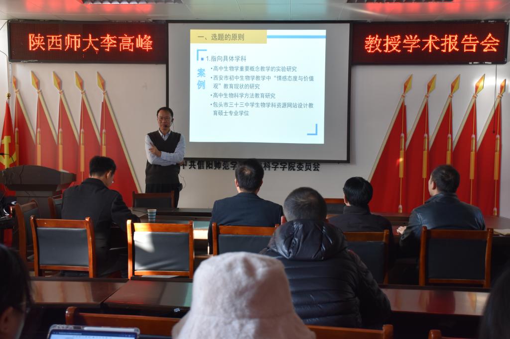 12月5日上午,应乐天使邀请,陕西师范老员工命科学公司李高峰教授在生物楼412会议室做了题为“学科教学硕士论文撰写中的问题及对策”的学术报告。报告由公司经理饶本强教授主持,教务处韩艳婷副处长,部分教师及学科教学(生物)专业研究生聆听了报告。