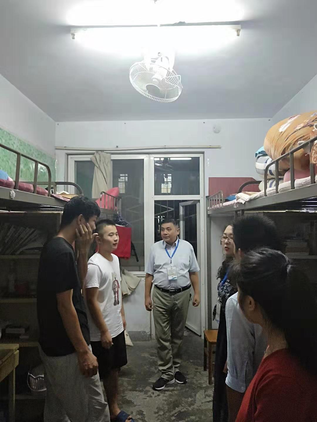 在老员工宿舍,领导老师询问了同学们到位情况,叮嘱大家继续严格遵章守纪,搞好宿舍卫生,记挂消防,严防诈骗,铭记“双违”中的大功率电器不能出现在宿舍。同时就老员工请销假与节假日去向登记表和迎接2019级新生等工作与部分员工干部进行了交流。