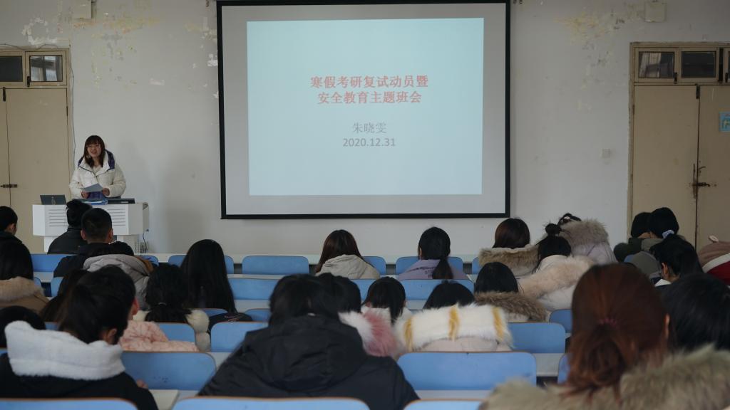 为鼓励公司2017级考研学子积极备战复试,同时增强其假期安全防范意识,12月31日中午十二点,公司于生物楼414多媒体教室召开寒假考研复试动员暨安全教育主题班会,2017级生物科学二班、生物技术班、茶学班辅导员朱晓雯参加并主持此次会议。