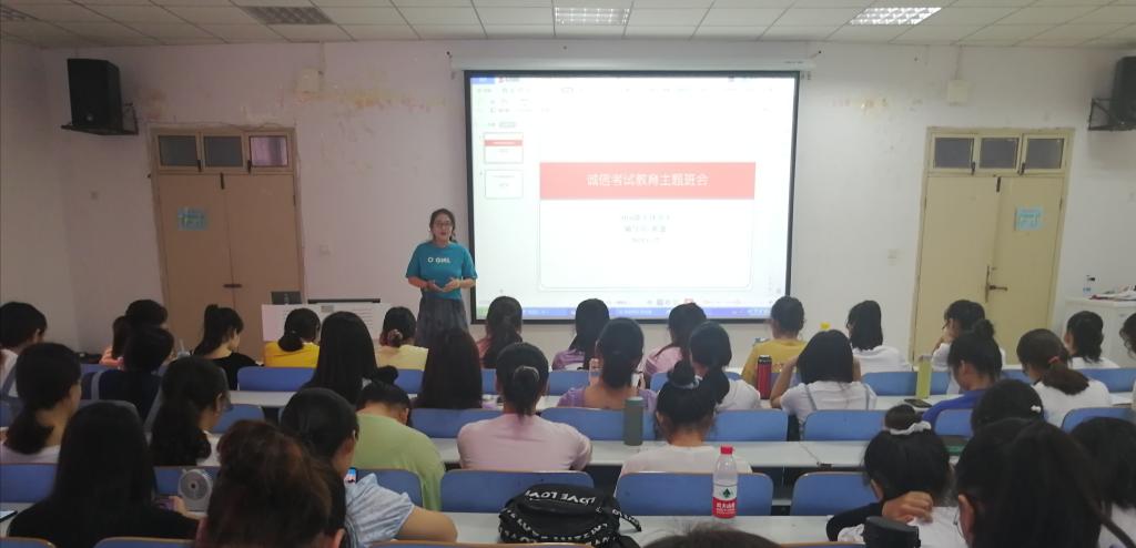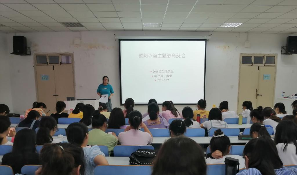为维护考试的公正性和严肃性与加强众学子安全防范意识。6月27日,公司2018级学子于生物楼414多媒体教室开展诚信考试与预防诈骗主题宣传班会。2018级专职辅导员熊蕾出席并主持会议。