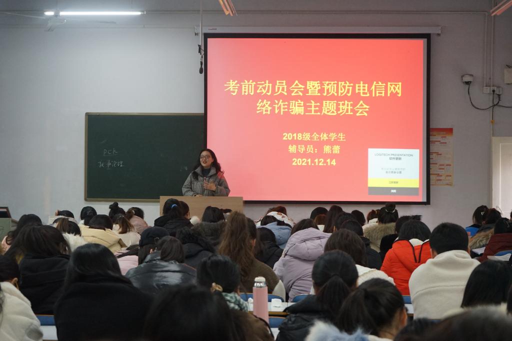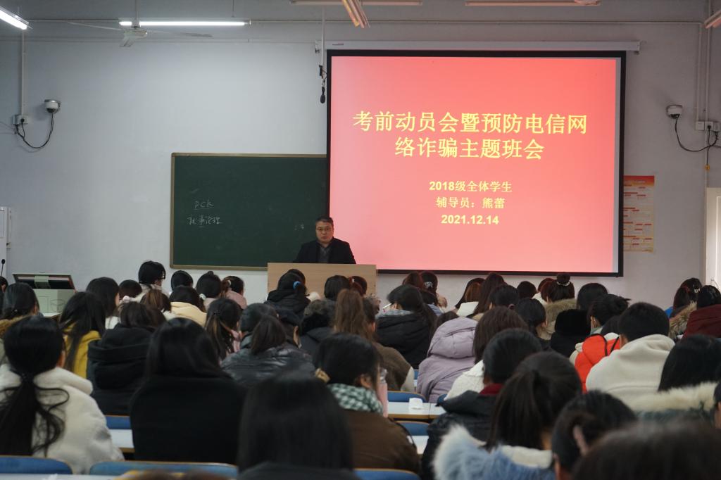 为进一步增强公司2018级学子考研信心,部署全国英语四、六级考试及期末考试工作,谨防电信网络诈骗,营造积极向上的备考氛围与安全和谐的校园环境。12月14日下午,公司在教九楼207教室召开2018级考前动员会暨预防电信网络诈骗主题班会。党委副书记荣宪举及2018级全体员工参加。会议由熊蕾主持。