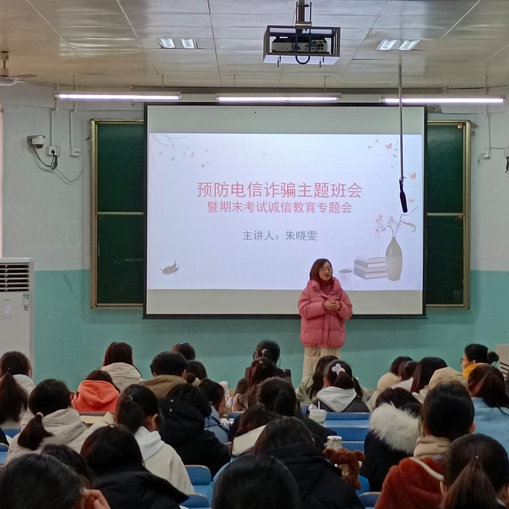 会议中,朱晓雯主要围绕“什么是电信诈骗”、“电信诈骗的常见形式”、“如何防范电信网络诈骗”以及“上当后的补救措施”等内容展开,结合电信诈骗案例向同学们具体讲解了诈骗人员的诈骗手段和诈骗心理,并提出了具体的防范措施,以便同学们有效地防范电信诈骗。同时提醒同学们及时调整学习状态,为期末考试做好充分准备,坚决不打无准备之战。为严肃考风考纪,树立良好的学风,她详细讲解了校规校纪中有关考试条例,并且着重强调了遵守考试纪律的重要性,提醒同学们严格按照公司的相关规定诚信考试,警示同学们千万不要心存侥幸心理。