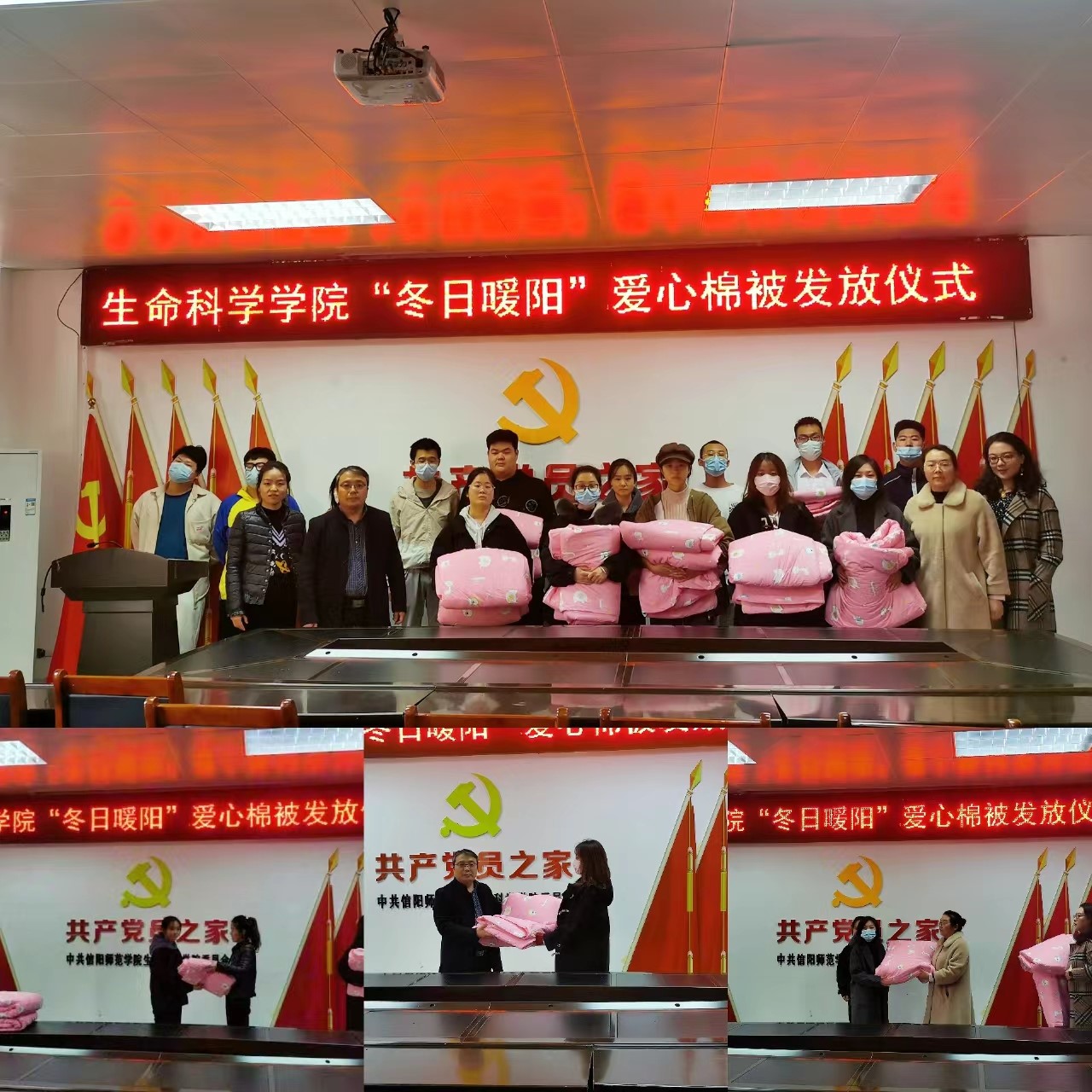 为更好地贯彻落实国家资助政策,推动教育事业的发展,进一步关心家庭经济困难员工的身心健康。11月24日下午,公司在生科楼412会议室开展“冬日暖阳”爱心棉被发放仪式。公司党委副书记荣宪举,各年级辅导员参加此次活动并为家庭经济困难的同学发放爱心棉被,为同学们送去公司的关怀和温暖。